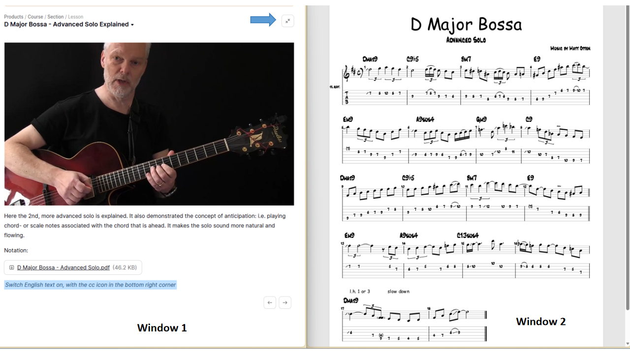 A nice arrangement is this: open the notation in a separate window; put this window on the right half of the screen. On the lesson page use the icon top right to remove the lesson list on the left, then put this window on the left side of the screen. Now you can see and play video and see notation side by side. If you work on a Windows system, you can use the Windows key+arrow shortcut to easily fit a window to the left or right half of the screen.