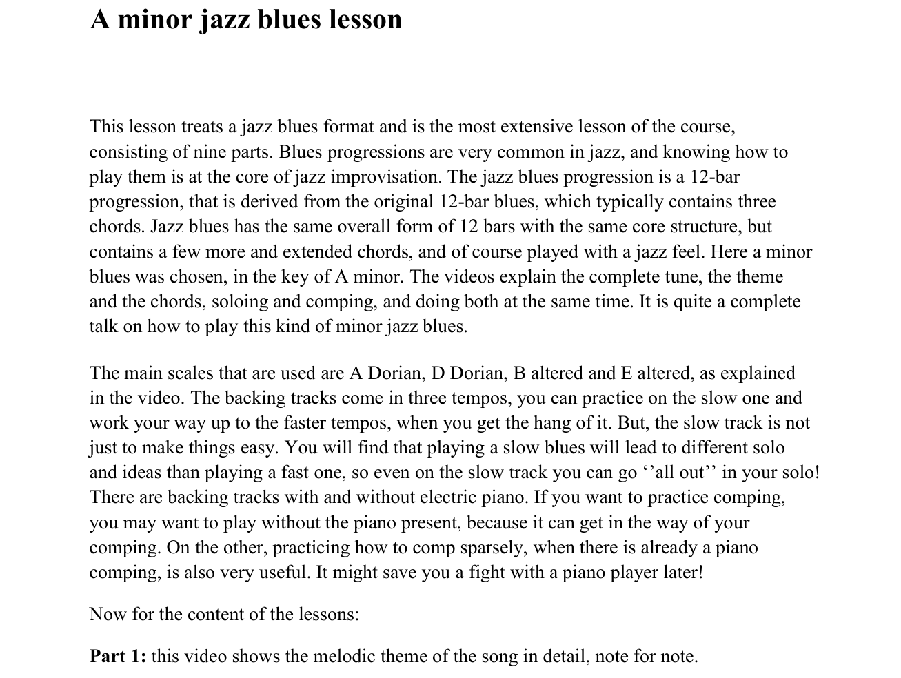 This course covers many jazz guitar topics, chords, scales, improvisation, styles, rhythms, techniques, comping, etc and is built around four tunes in different main stream and contemporary jazz styles that are used as vehicles to explain and demonstrate all of these concepts. Most lessons consist of videos, with an animated fretboard inserted to show exactly what is being played and explained. All tunes have real backing tracks in various tempos that you can use to practice. A chord primer is provided as an additional document for download.